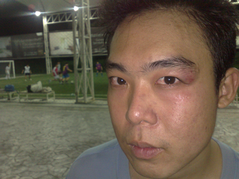 สัปดาห์ก่อน เจอเพื่อนเอกเตะบอลอัดแว่นยัดเข้าไปที่ดั้ง เลือดกระฉูด สัปดาห์นี้ ศูนย์หน้าตัวเก๋าเจ็บต่ออีก โดนศอกของเจ้าหมูน้อย เข้าเบ้าตา เชื่อว่าแม๊ทซ์หน้าท่านเซอร์ยังคงจับลงไปโดนอีก